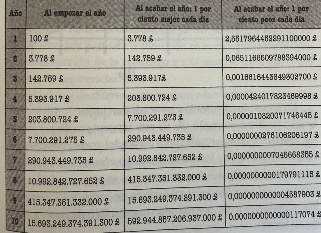 Con el tiempo, la diferencia entre dejar que algo empeore en un 1% cada día frente hacer que mejore un 1% cada día, es significativa:
